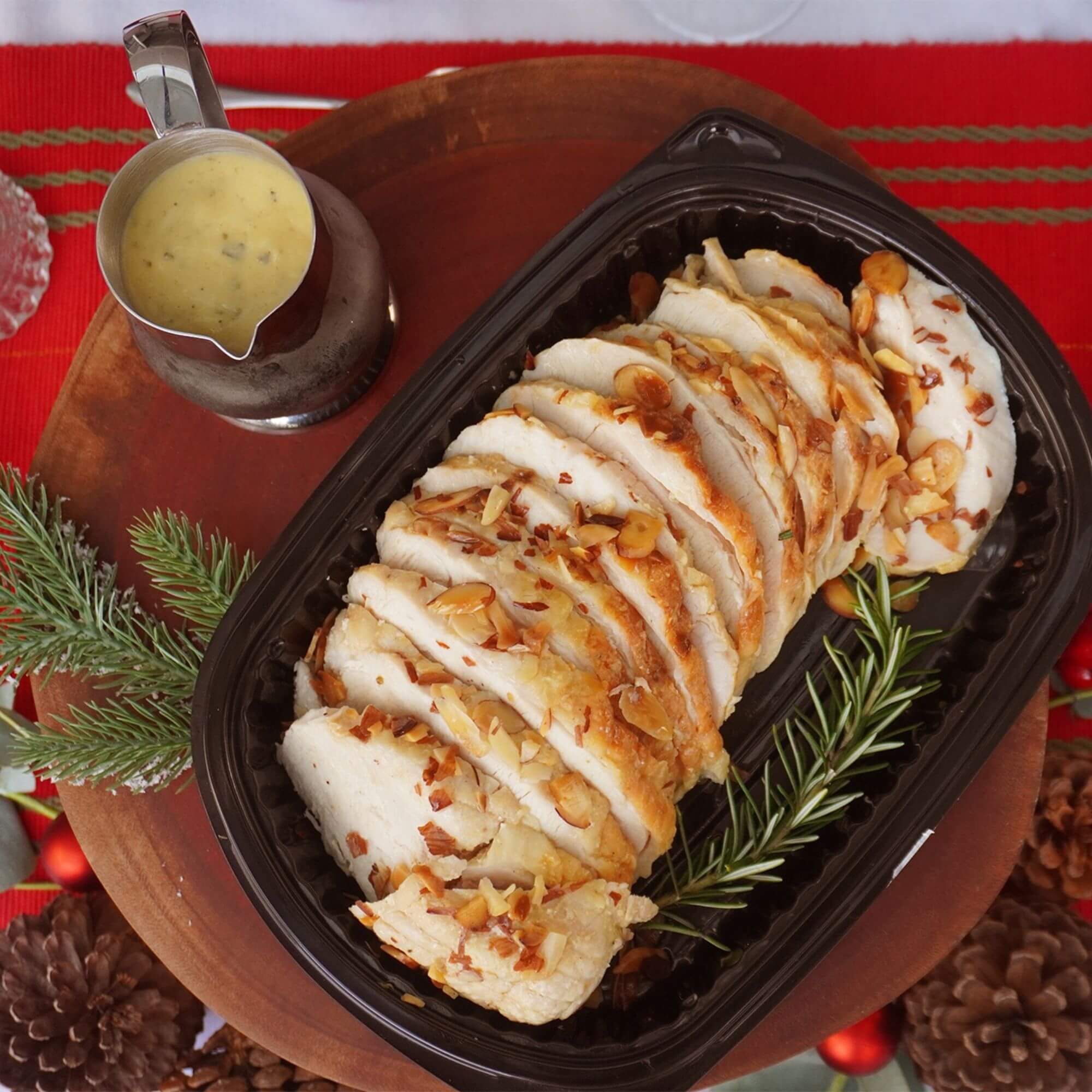 Descripción: Rebanadas de pechuga de pavo, marinado en salvia fresca, cubiertas con un cremoso gravy y almendra tostada.